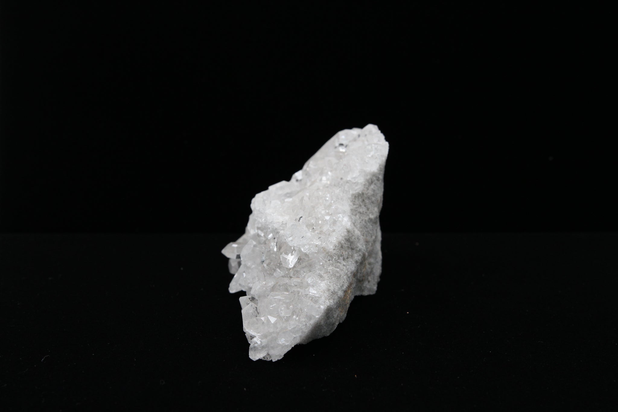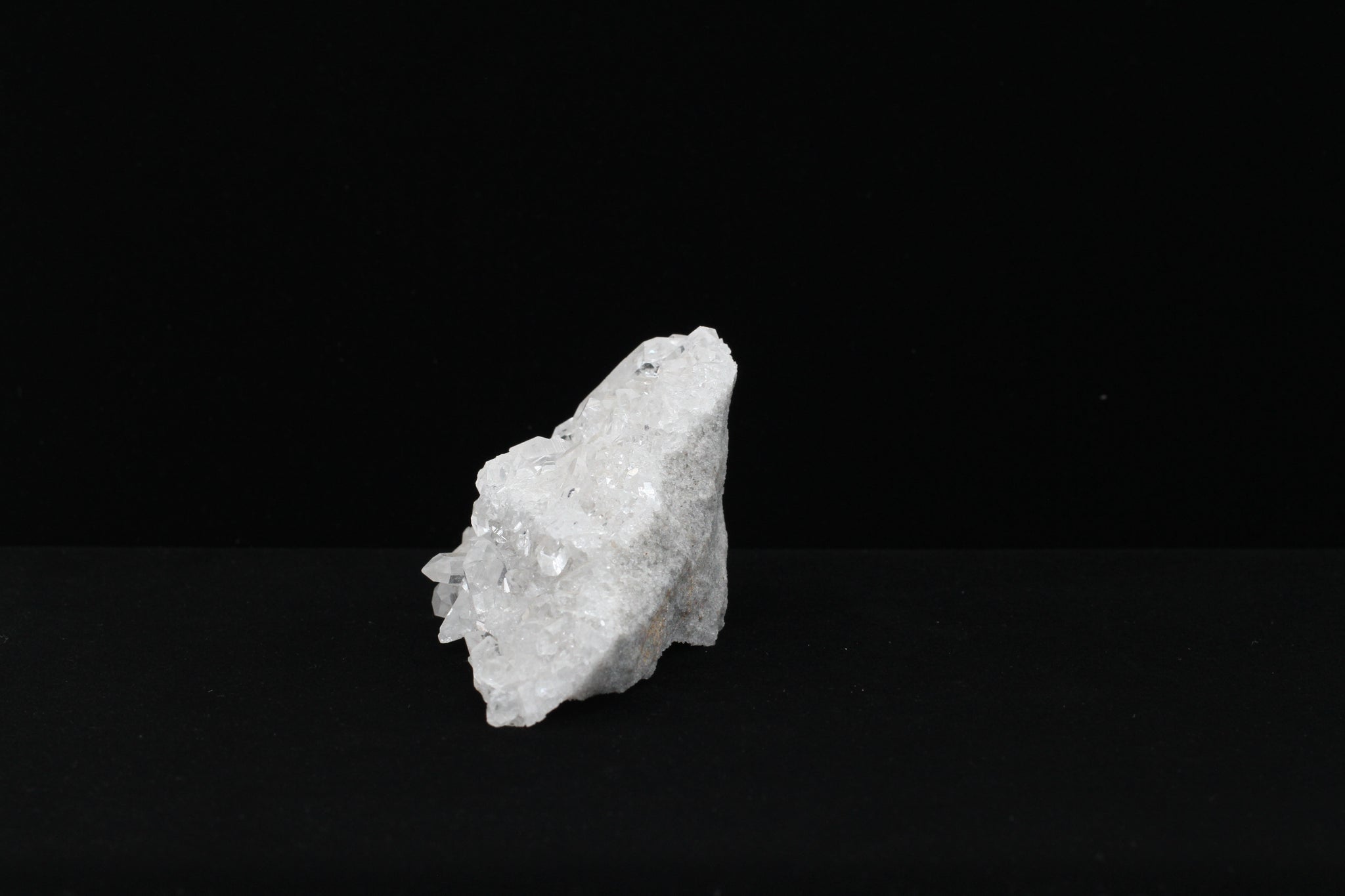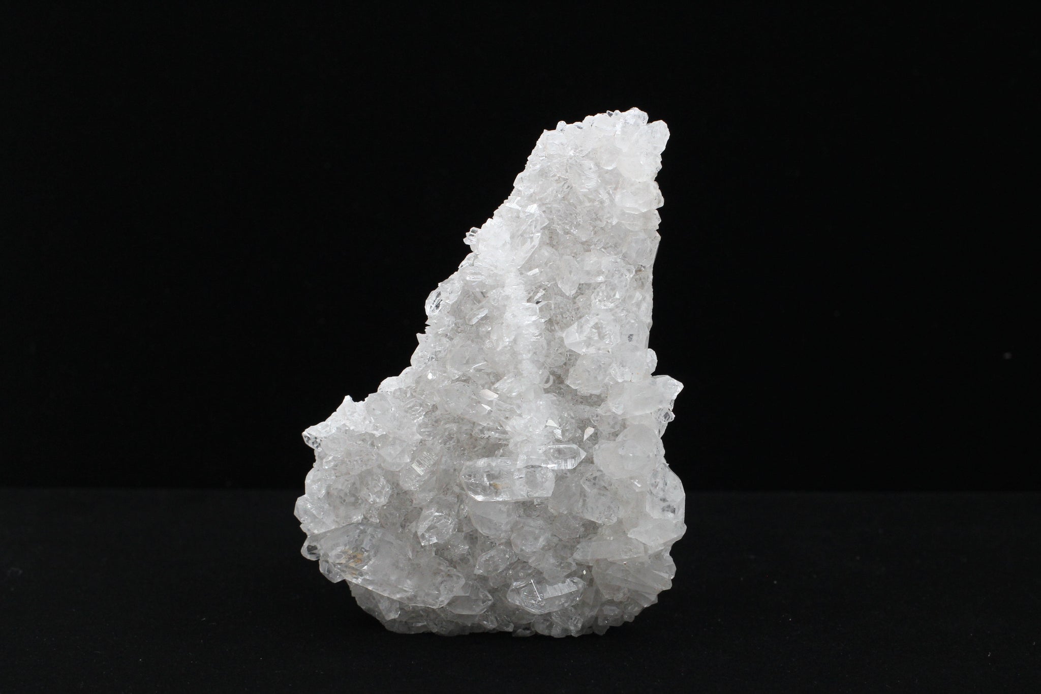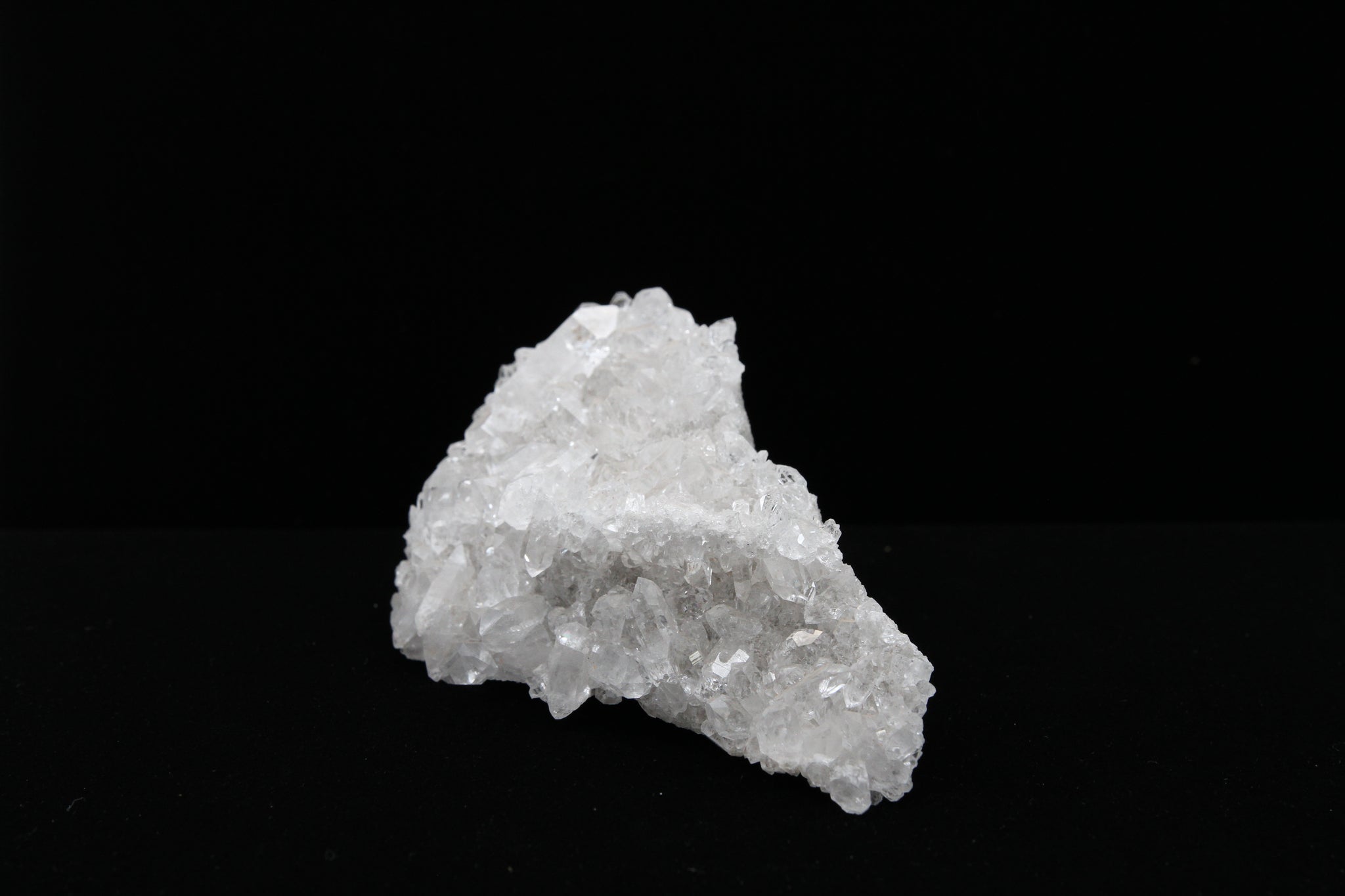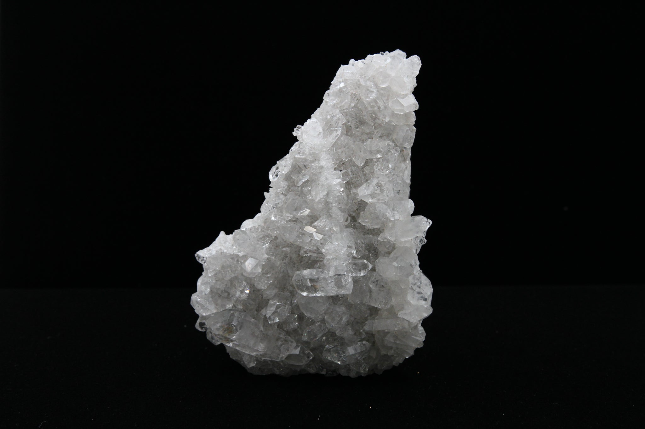 A mini sized quartz crystal cluster from the Garfield Lewis Claim, Fisher Mountain, Montgomery County Arkansas. Laying on side 9cm long x 4cm wide x 5cm tall. Standing upright 9cm tall x 7cm wide x 4cm deep. 208grams. This Quartz Crystal Cluster's unique number is AM000100.